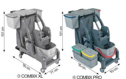 Für die Flur-, Zimmer- und Badreinigung in öffentlichen Einrichtungen, Büros, Hotels, Pensionen. Farblich getrennte Wischeimer und Halterung für Wäsche-/ Müllsack.Der Reinigungswagen in Profiqualität besteht aus zwei robusten Kunststoff Bodenplatten, wobei die hintere Ablage je nach Bedarf abgenommen werden kann. Die stabilen Metall-Lenkrollen und die großen, gummierten Hinterräder erfüllen die Anforderungen für den täglichen, Einsatz. Der Deckel über dem Wäsche-/ Müllsack kann bequem vom ergonomisch geformten Schubbügel aus bedient werden. Ein Mopp oder Besen kann sicher im integrierten Halter fixiert werden. Für das Warnschild ist eine gesonderte Halterung am Rahmen integriert. Serienmäßig wird der PuriX mit vier Eimern, einer seitlichen Moppablage, geräumigem 120 Liter Wäsche-/Müllsack und einer Doppelbacken-Mopp-Presse ausgeliefert. Am Wagen kann eine Medusa Akkukehrmaschine mitgeführt werden.